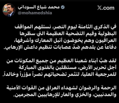 السوداني بالذكرى الثامنة ليوم النصر: لقد هبَّ أبناء شعبنا العظيم من جميع المكونات من أجل تحرير الأرض