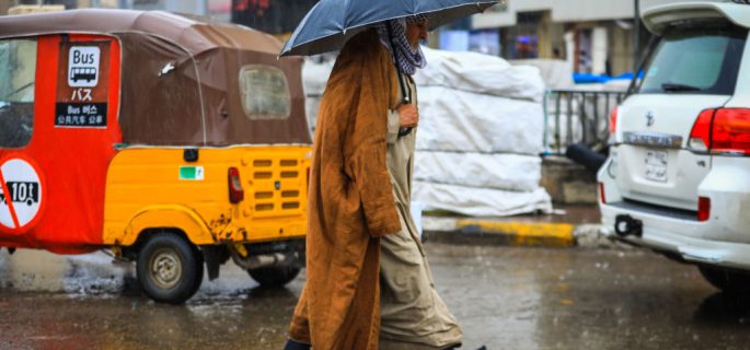 BAGHDAD, IRAQ - JANUARY 04: An elderly man walks with an umbrella on the streets as heavy rains lash the country in Baghdad, Iraq on January 04, 2023. (Photo by Murtadha Al-Sudani/Anadolu Agency via Getty Images)