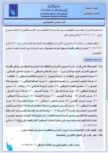المفوضية العليا تعلن رفض تسجيل 26 حزباً لعدم استكمال متطلبات التأسيس القانونية