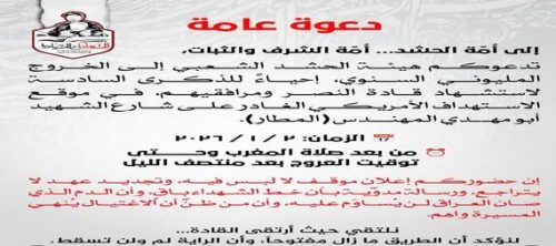 دعت هيئة الحشد الشعبي، الاوساط الشعبية والمجتمعية ، إلى الخروج المليوني السنوي، إحياءً للذكرى السادسة لاستشهاد قادة النصر ومرافقيهم، في موقع الاستهداف الأمريكي على شارع الشهيد أبو مهـ ـدي المهنـ ـدس (المطار) ، وذلك مساء يوم الثاني من كانون الثاني المقبل، ” بعد صلاة المغرب وحتى توقيت حادثة الاستشهاد بعد منتصف الليل” /انتهى