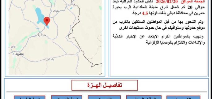 أعلنت الهيئة العامة للأنواء الجوية والرصد الزلزالي، اليوم، تسجيل هزة أرضية داخل الحدود العراقية بلغت قوتها 4.5 درجات على مقياس ريختر، شمال شرق مدينة المقدادية في محافظة ديالى، قرب بحيرة حمرين