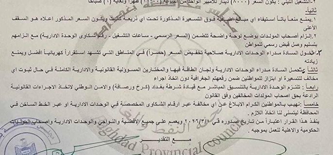 محافظة بغداد تحدد تسعيرة المولدات لشهر اذار
