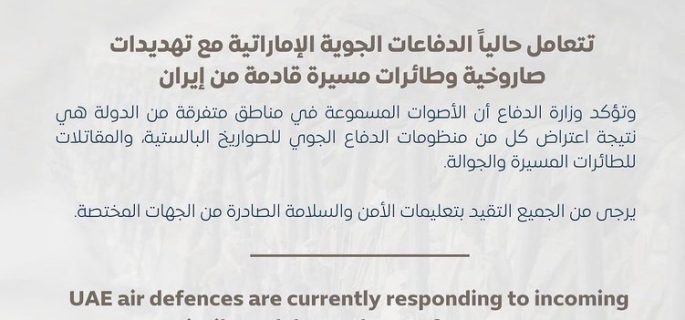 الدفاعات الإماراتية تتعامل مع رشقة من الصواريخ الإيرانية