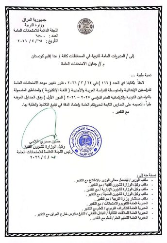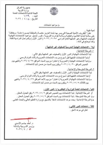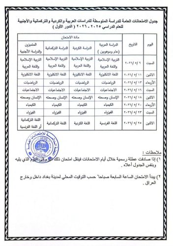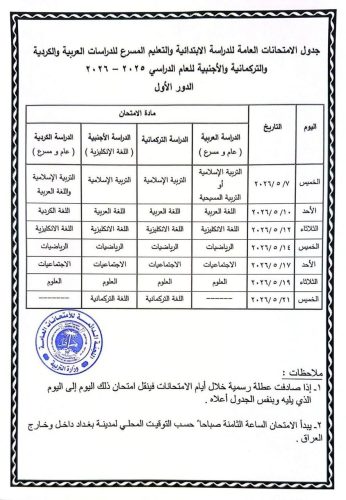 التربية تنشر جداول الامتحانات النهائية للسادس الابتدائي والثالث متوسط