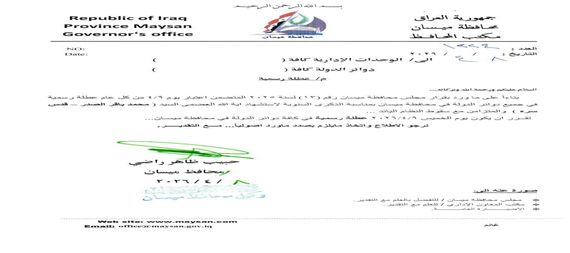 وأضافت المحافظة أن العطلة تشمل جميع دوائر الدولة في عموم ميسان، داعية الجهات المعنية إلى الالتزام بمضمون القرار”. انتهى