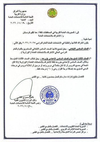 وأوضح المكتب أن “الاشتراك في الامتحانات سيكون لجميع تلاميذ الصف السادس الابتدائي المستمرين بالدوام، بينما يحق لطالب الصف الثالث المتوسط وطالب الصف السادس الإعدادي الاشتراك إذا كان ناجحًا في جميع الدروس، أو مكملاً في درس أو درسين أو ثلاثة دروس في درج