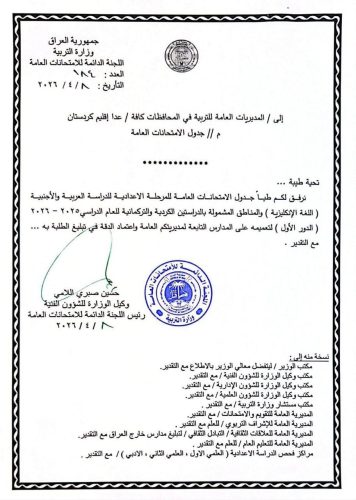 وذكر بيان للوزارة، انها “تعلن عن جدول الامتحانات العامة للمرحلة الإعدادية للدراسة العربية والأجنبية (اللغة الإنكليزية)، والمناطق المشمولة بالدراستين الكردية والتركمانية للعام الدراسي ٢٠٢٥–٢٠٢٦ (الدور الأول)، مؤكدًا ضرورة تبليغ الطلبة بالمواعيد بدقة”.