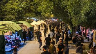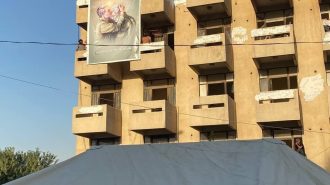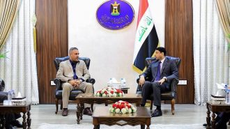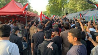 مصدر : المتظاهرون على نتائج الانتخابات يرفعون صورة المهندس وسليماني على بناية قريبة من الخضراء