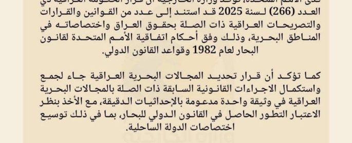 سياسة ـ الرأي ـ أكدت وزارة الخارجية العراقية، اليوم، أن تحديد المجالات البحرية لـالعراق يُعد شأناً سيادياً لا يحق لأي دولة التدخل فيه، وذلك رداً على احتجاج الكويت بشأن هذا الملف وذكرت الوزارة في بيان، أن الإجراءات العراقية استندت إلى القانون الدولي وأحكام الأمم المتحدة، مبينة أن إيداع خريطة المجالات البحرية لدى المنظمة الدولية جاء المزيد