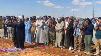 حشود من العراقيين تقيم صلاة الجمعة على الحدود الاردنية نصرة لغزة