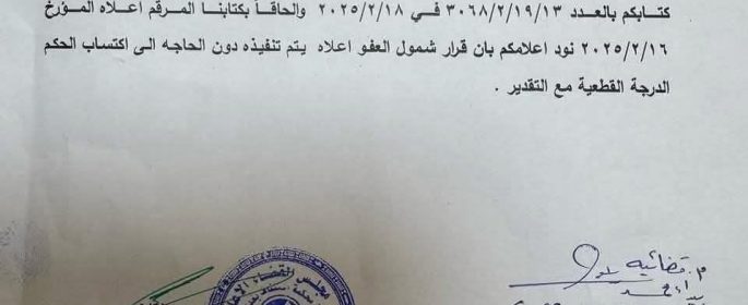 بالوثيقة : القضاء يوجه دائرة السجون بتنفيذ العفو العام واطلاق سراح المشمولين “فوراً”
