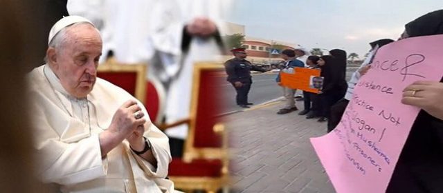نظم عدد من أقارب السجناء المحكوم عليهم بالإعدام في البحرين تظاهرة محدودة على طريق “البابا فرنسيس” وطالبوا بتدخله للإفراج عن المعتقلين السياسيين في البحرين. ونشر معهد البحرين للقانون والديمقراطية ومقره لندن والجماعة الإسلامية الوطنية في الوفاق البحرين مقطع فيديو للمظاهرة التي شارك فيها عدد من النساء والأطفال. وكتب على إحدى اللافتات: “التسامح والتعايش ممارسة وليس المزيد